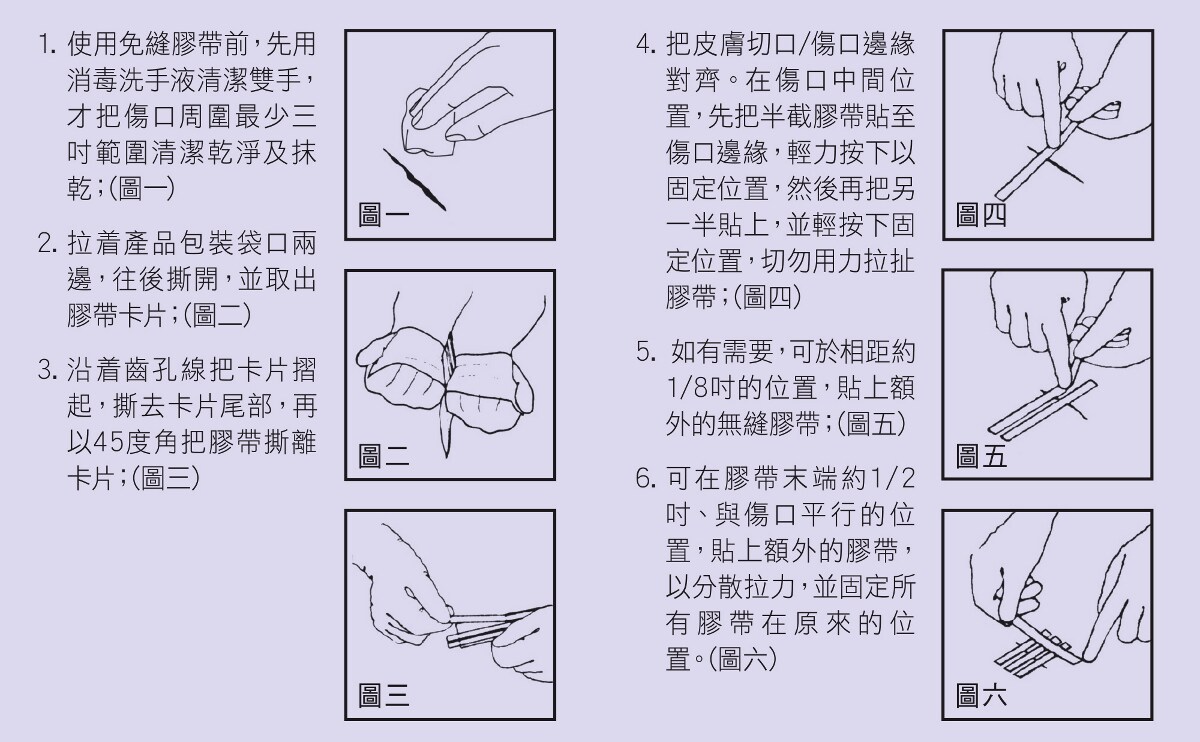 • 免縫膠帶可以配合傷口縫線或縫針一起使用,也可以在它們移除後使用